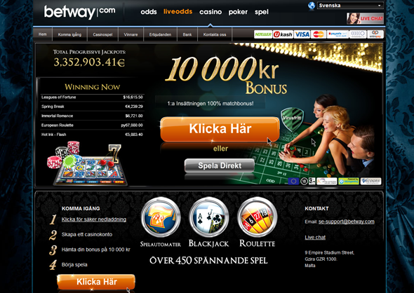 Betway är nog ett av de mer kompletta casinon online. De har förutom casino även online odds, online poker och självklart ett casino och odds utbud för mobiler och plattor. Med över 600 olika casino spel i sin spelklient så finns det garanterat favoriter som passar dig. Om du föredrar att spela direkt i din webbläsare så finns ca 200 av dessa spel att välja på vilket nog kan anses vara ett av de större utbuden.